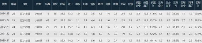 上赛季由于伤病影响,张镇麟仅为辽宁队出战16场常规赛首发15次,场均上阵31.4分钟,贡献13.3分3.5板4.8助1.4断,三项命中率41.6%、32.5%和90%;季后赛则是场均上阵25分钟,得到7.8分1.7板1.8助,三项命中率32.7%、16.7%和68.8%。