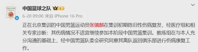同时正因如此,张镇麟入选了今夏中国男篮集训大名单但没几天就宣布因陈旧性伤病复发退出,从而无缘出战2025年亚洲杯正赛。