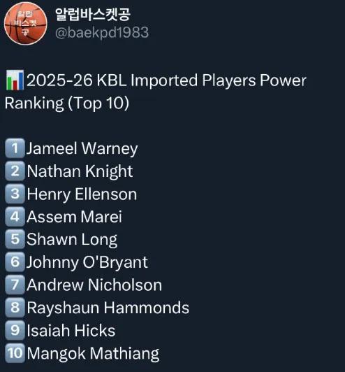 雷速体育8月28日讯 近日韩国记者Baekpd1983评选出了新赛季KBL联赛的十大外援,其中前CBA外援有五人上榜。