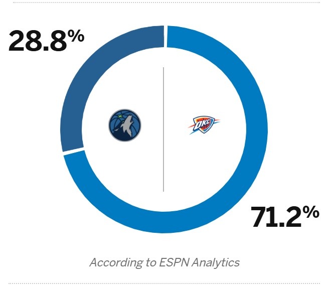 一边倒!ESPN预测西决G2胜率:雷霆71.2%森林狼仅28.8%