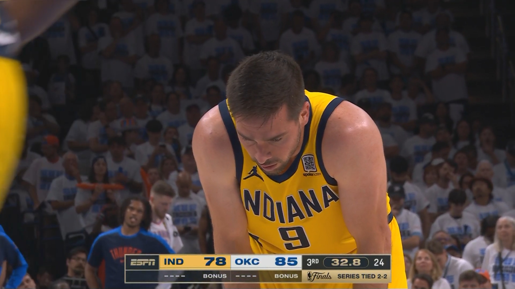 06月17日讯 总决赛天王山之战,三节结束,步行者79-87落后雷霆8分。第三节步行者一度落后15分,麦康纳后半节爆发,连续得分,单节独揽13分,帮助球队保留了悬念!