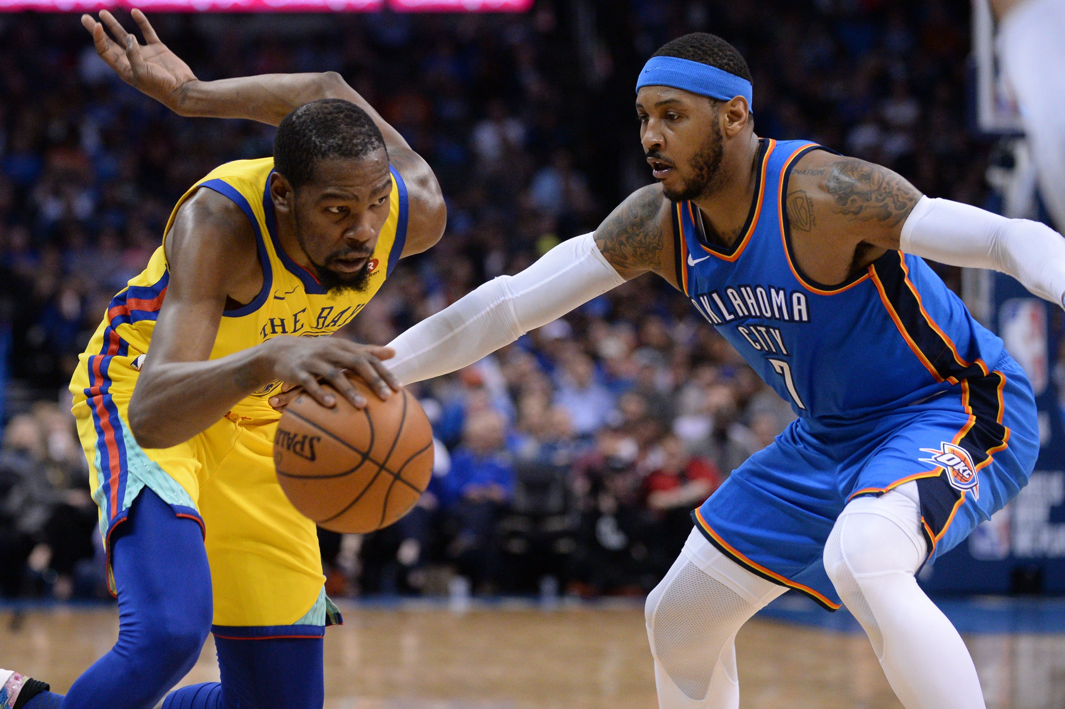 安东尼这位十次入选全明星的球员投篮命中率为44.7%,三分球命中率为35.5%。而杜兰特三项命中率几乎达到了50/40/90的水平,场均投篮命中率为50.2%,三分球命中率为39%,罚球命中率为88.2%。