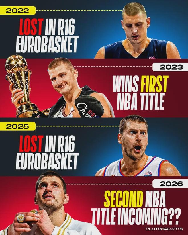值得一提的是,22年欧锦赛约基奇率领的塞尔维亚同样止步于16强,紧接着22-23赛季带领掘金夺冠。