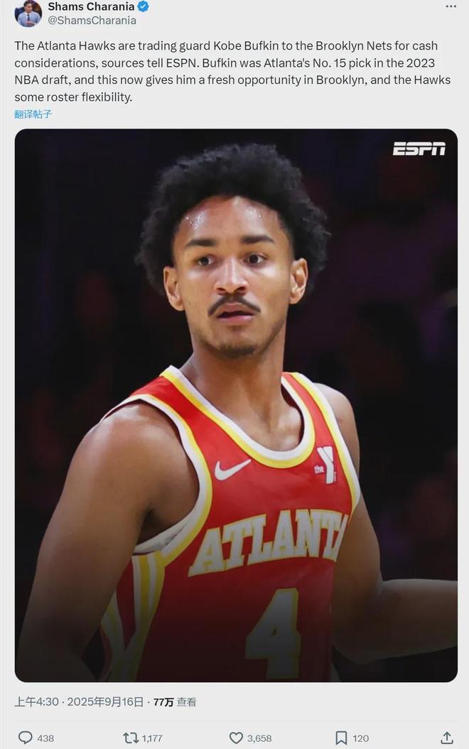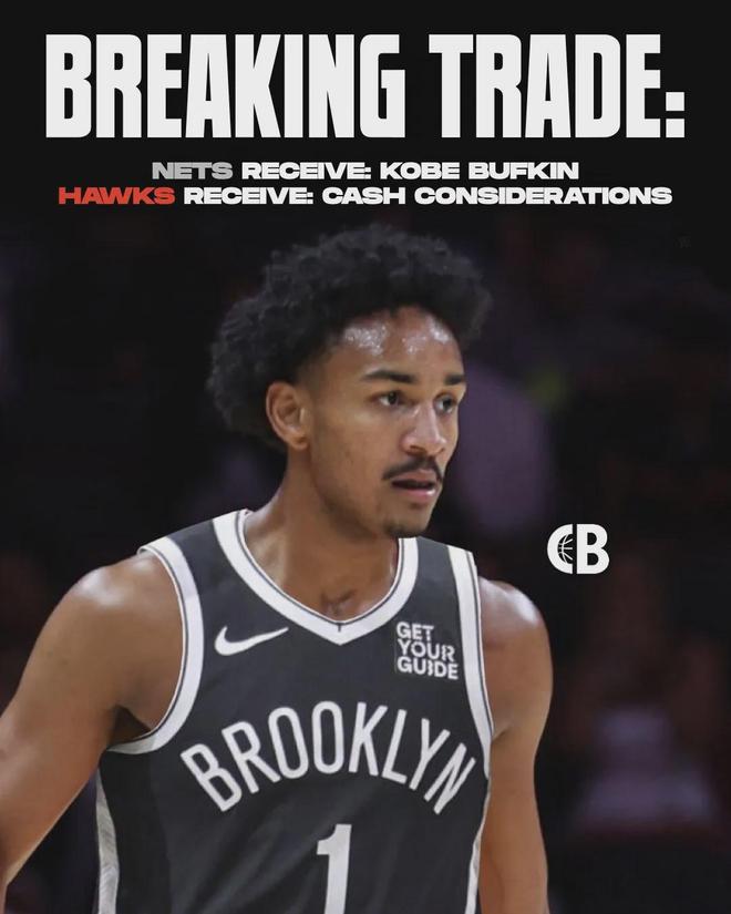 据报道,老鹰跟篮网完成交易,他们送出了2023年首轮15号秀巴夫金,从篮网换来了11万美元的现金。