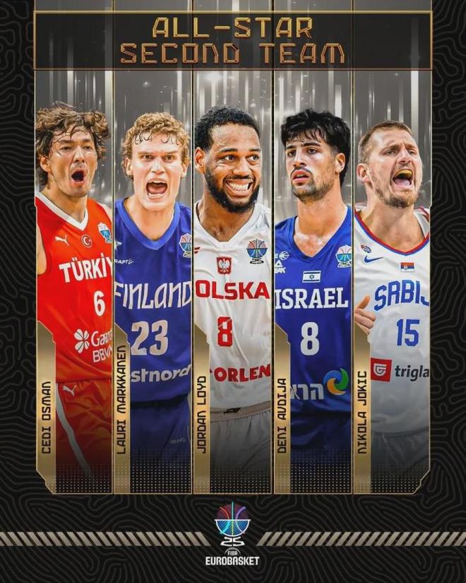 今年欧锦赛,马尔卡宁带领芬兰男篮杀进四强,该届赛事场均贡献23.1分8.1板2.2助,入选了最佳阵容二阵,其余4人分别是约基奇(塞尔维亚)、阿夫迪亚(以色列)、奥斯曼和劳埃德(波兰)。