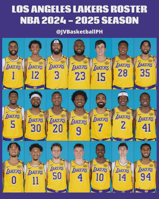 2024-25赛季常规赛开始之前,湖人的阵容名单:詹姆斯、浓眉、里夫斯、拉塞尔、八村塁、范德比尔特、克内克特、文森特、海斯、克里斯蒂、雷迪什、席菲诺、伍德、刘易斯、布朗尼、科洛克、特拉奥雷、奥利瓦里。