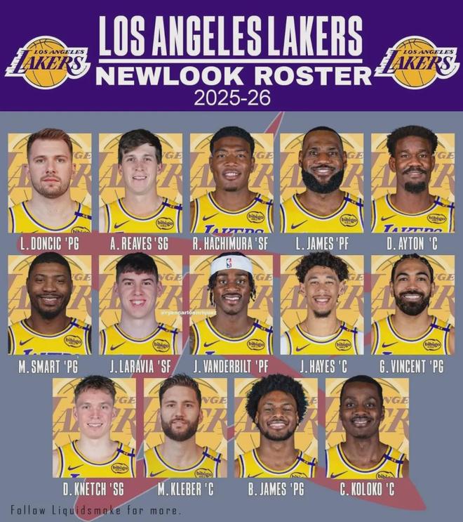 2025-26赛季开始之前,湖人的阵容名单:东契奇、詹姆斯、里夫斯、文森特、斯玛特、克内克特、八村垒、范德比尔特、拉拉维亚、艾顿、海斯、克莱伯、阿杜-蒂耶罗、布朗尼、尼克-史密斯、科洛克、克里斯-马农 。