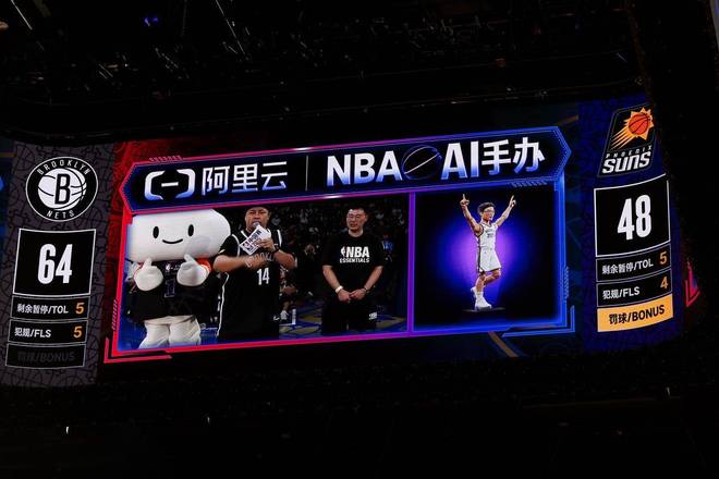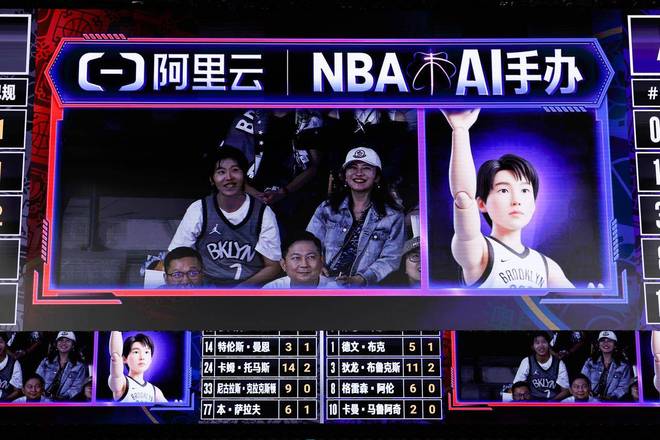 球场大屏还会通过现场摄像头捕捉身穿球衣的球迷形象,随后由阿里云 AI 生成专属「球迷潮玩」——穿着主队球衣,配合动作,以「球星收藏手办」的形式展现在屏幕上,并与真人同框对比。这是 NBA 赛场上呈现的的首个 AI-CAM Show,是将赛事观看与球迷互动的一次深度重塑。