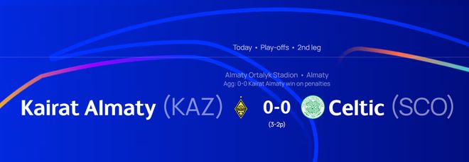 北京时间8月27日凌晨,欧冠附加赛次回合一场比赛,阿拉木图凯拉特跟凯尔特人苦战120分钟,仍是0-0互交白卷,两回合比分也是0-0平。最终,阿拉木图凯拉特在点球大战中3-2淘汰凯尔特人,
