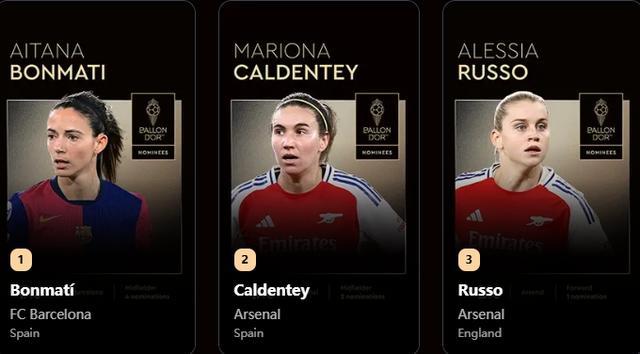 09月23日讯 2025年金球奖公布,邦马蒂夺得女足金球奖,卡尔登泰获第二,鲁索第三。三人数据荣誉对比:邦马蒂2024/25赛季共出战58场,打进20球助攻16次,帮助巴萨女足夺得女足西甲冠军、