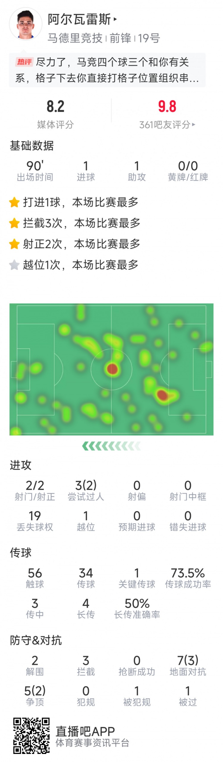 阿尔瓦雷斯本场数据:传射建功,2次射门均射正,3次拦截