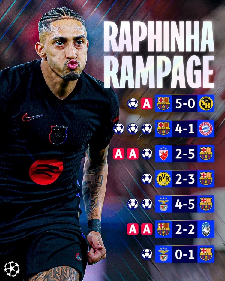 拉菲尼亚本赛季9场欧冠有7次参与进球,共计9球5助攻&战拜仁戴帽