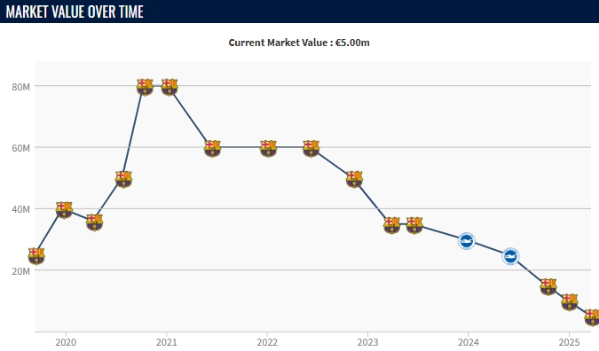 2020年时,17岁的法蒂身价就达到了8000万欧元,但半月板撕裂让法蒂伤缺超过10个月,也失去了在巴萨队中的位置。上赛季法蒂被租借到布莱顿,也没能找回昔日的状态。