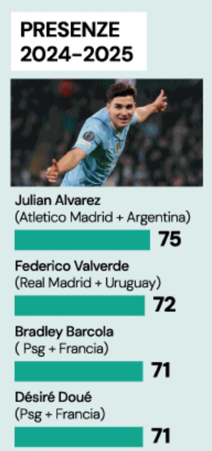 06月25日讯 随着马竞出局,阿尔瓦雷斯彻底结束本赛季的比赛。据统计,24/25赛季小蜘蛛一共出战了马竞+阿根廷75场比赛。排名第二的是巴尔韦德(72场),身后是巴尔科拉(71场)和杜埃(71场)。根据目前世俱杯的赛场,如果皇马能继续通关,巴尔韦德有望超越小蜘蛛的出场次数。