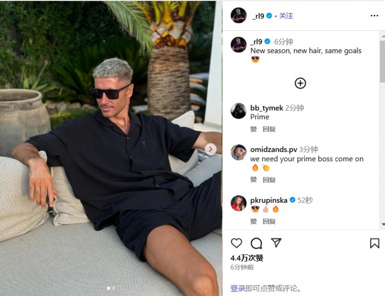 奶奶灰+墨镜,莱万社媒晒新造型:新赛季,新发型,同样的进球