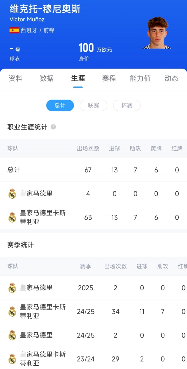 21岁的西班牙前锋穆尼奥斯,至今代表皇马一线队出场4次,目前他的德转身价为100万欧元。