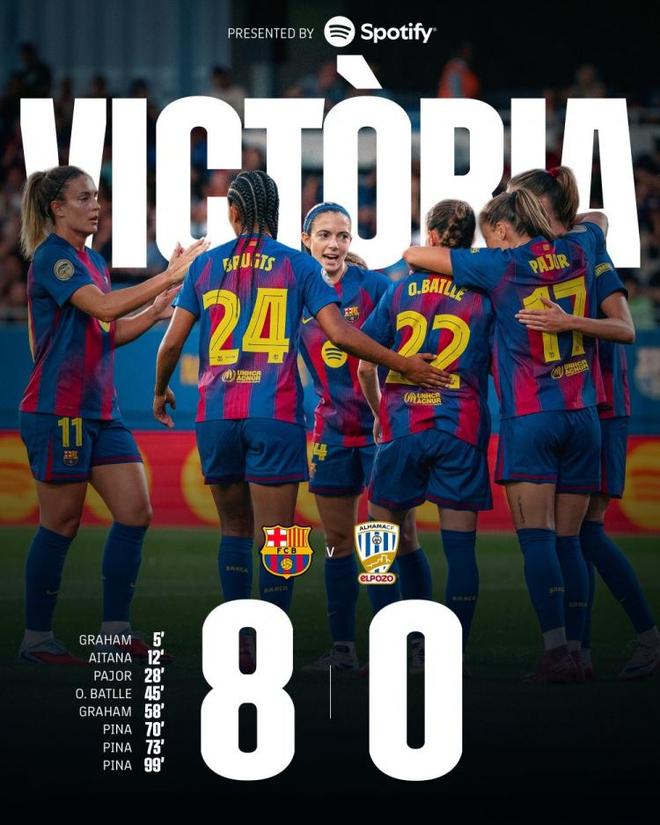 8月31日讯 西甲女足首轮,巴萨女足8-0大胜升班马阿尔哈马,顺利取得开门红。克劳迪娅-皮纳上演帽子戏法,格雷厄姆-汉森梅开二度,此外艾塔娜、帕若尔和奥娜-巴特列也各有斩获。