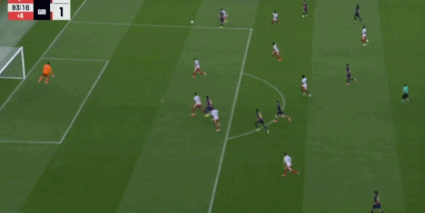 比赛的第13分钟,亚马尔右路横传,佩德里转身晃开角度之后左脚低射,球击中门柱之后反弹入网,1比0!
