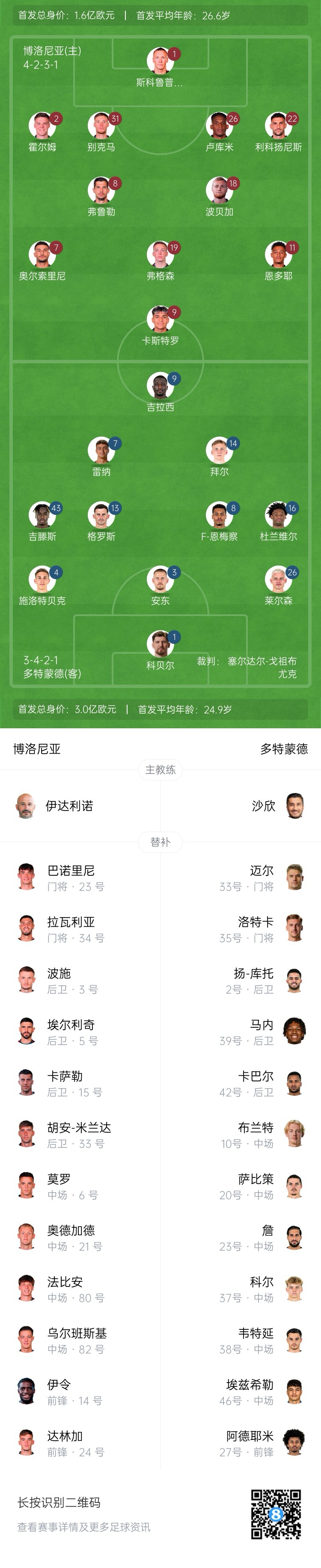 博洛尼亚替补:23-巴诺里尼、34-拉瓦利亚、3-波施、5-埃尔利奇、33-胡安-米兰达、6-莫罗、14-伊令、15-卡萨勒、21-奥德加德、24-达林加、80-法比安、82-厄本斯基