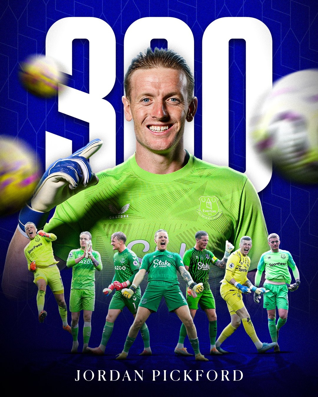 埃弗顿官方晒出海报向皮克福德表示祝贺,并写道:为埃弗顿出场300次,这是我们的门将皮克福德