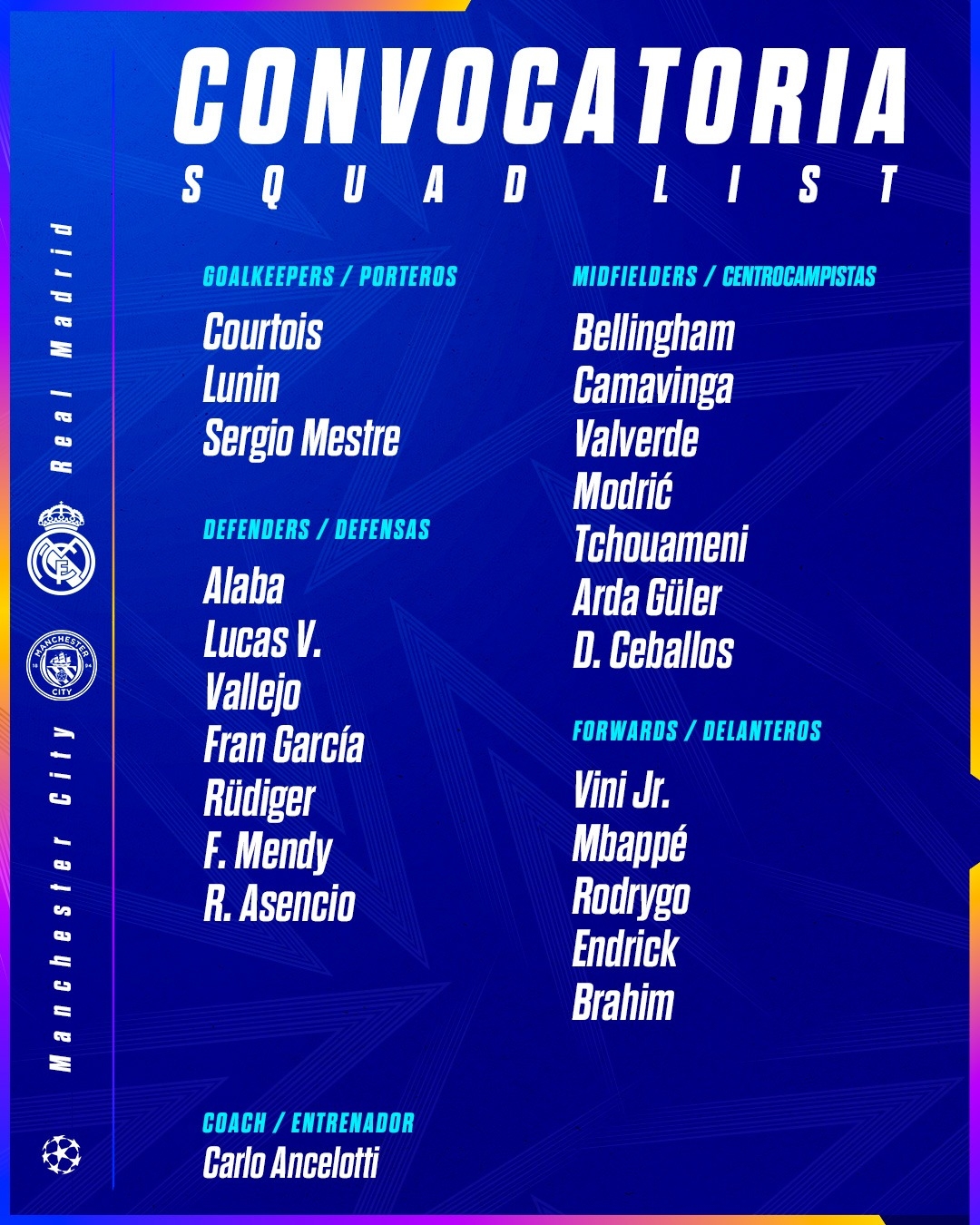 多名伤员回归!皇马战曼城名单:姆巴佩领衔!吕迪格、阿拉巴在列