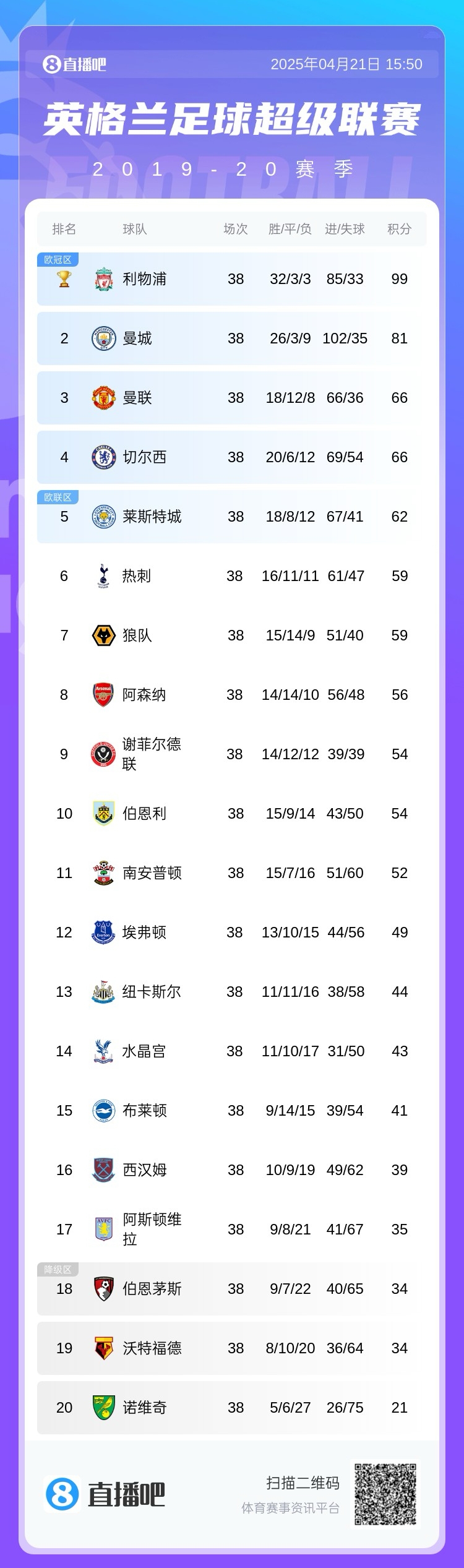 英格兰顶级联赛最快夺冠排行:利物浦1920赛季提前7轮夺冠仍居首