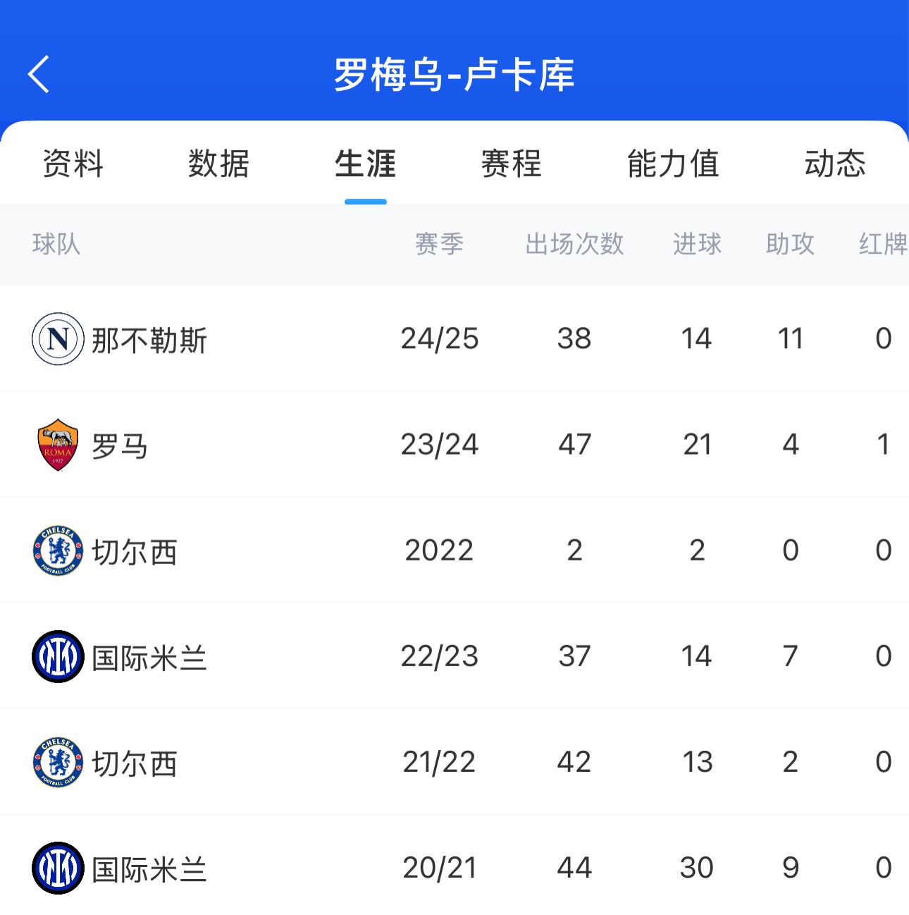 卢卡库近5个赛季的经历: