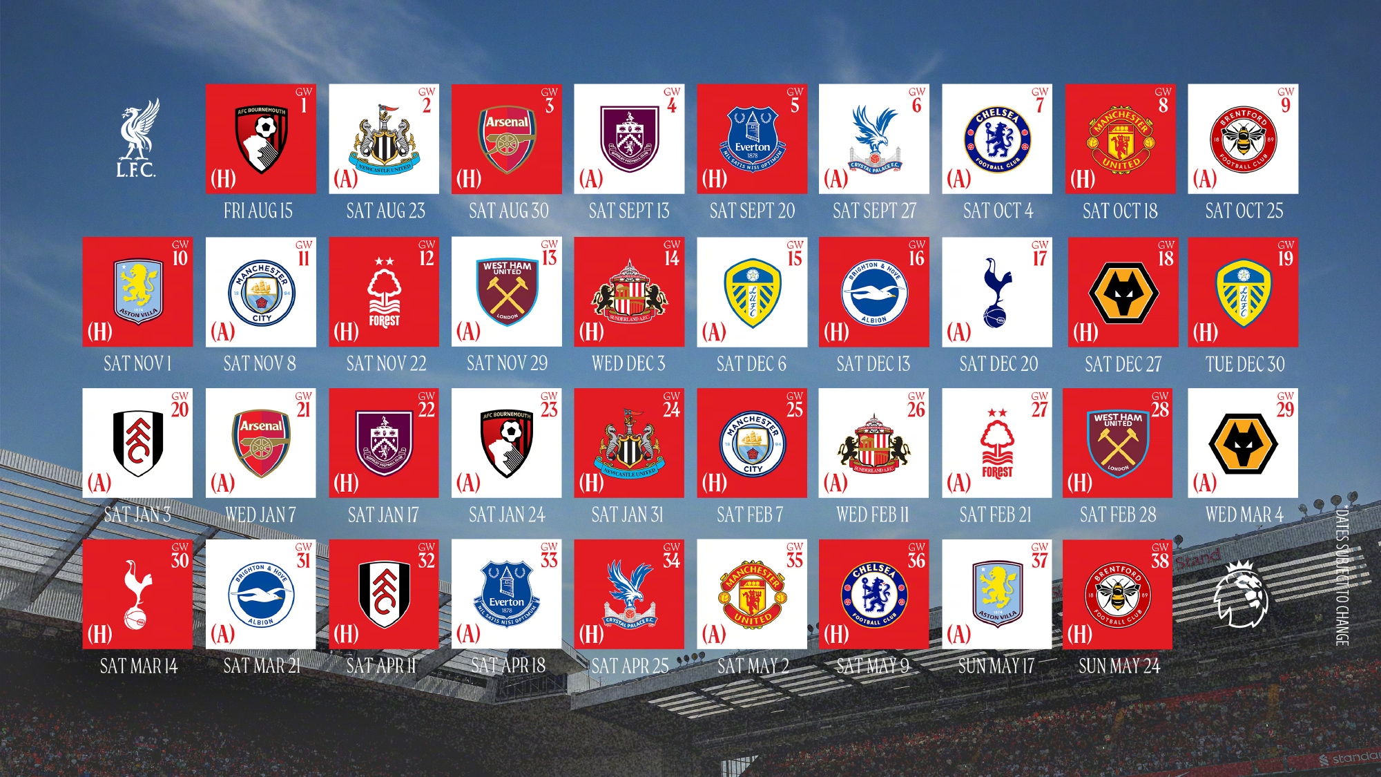 利物浦新赛季赛程:8月16揭幕战对伯恩茅斯,10月连战切尔西曼联