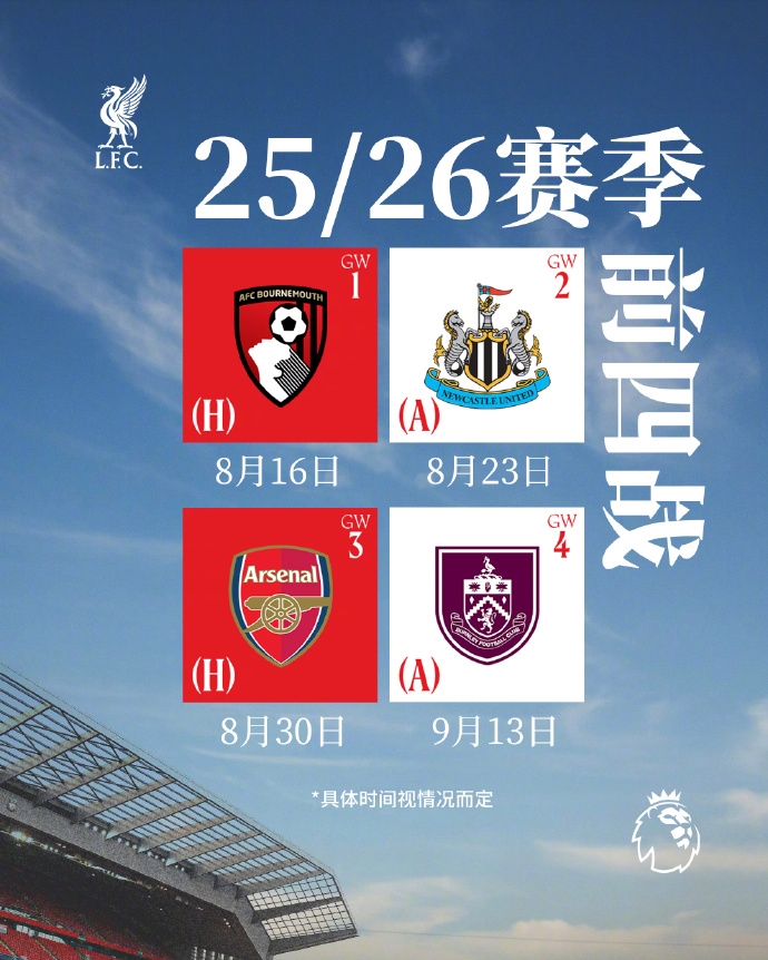 06月18日讯 25/26赛季英超赛程出炉,利物浦揭幕战对手是伯恩茅斯,比赛将于北京时间8月16日周六3:00进行,红军坐镇安菲尔德开启新赛季!第1轮,2025年8月16日,利物浦 v 伯恩茅斯(3:00,揭