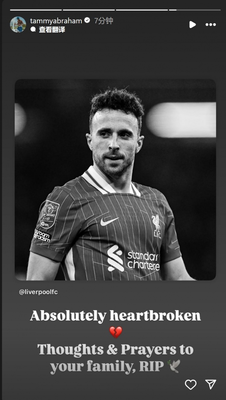 亚伯拉罕社媒哀悼若塔:心碎不已,向球员家人致以慰问和祈祷