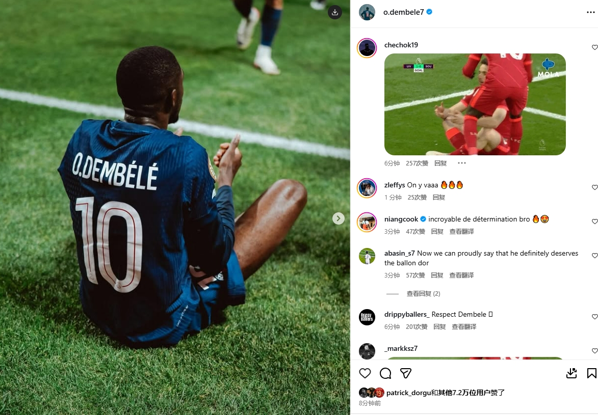 07月06日讯 登贝莱赛后发布社媒,晒出了自己本场比赛的照片。