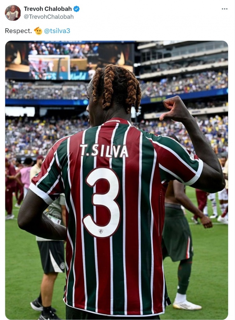 7月9日讯 世俱杯半决赛,切尔西2-0击败弗鲁米嫩塞,晋级决赛。此役查洛巴为切尔西踢满全场,赛后他与蒂亚戈-席尔瓦互换球衣。查洛巴社媒晒出身穿蒂亚戈-席尔瓦球衣的照片,配文:“敬