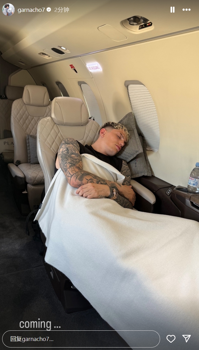 7月10日讯 曼联边锋加纳乔更新社媒,晒出自己在飞机上小憩的照片,配文“coming(来了)”。