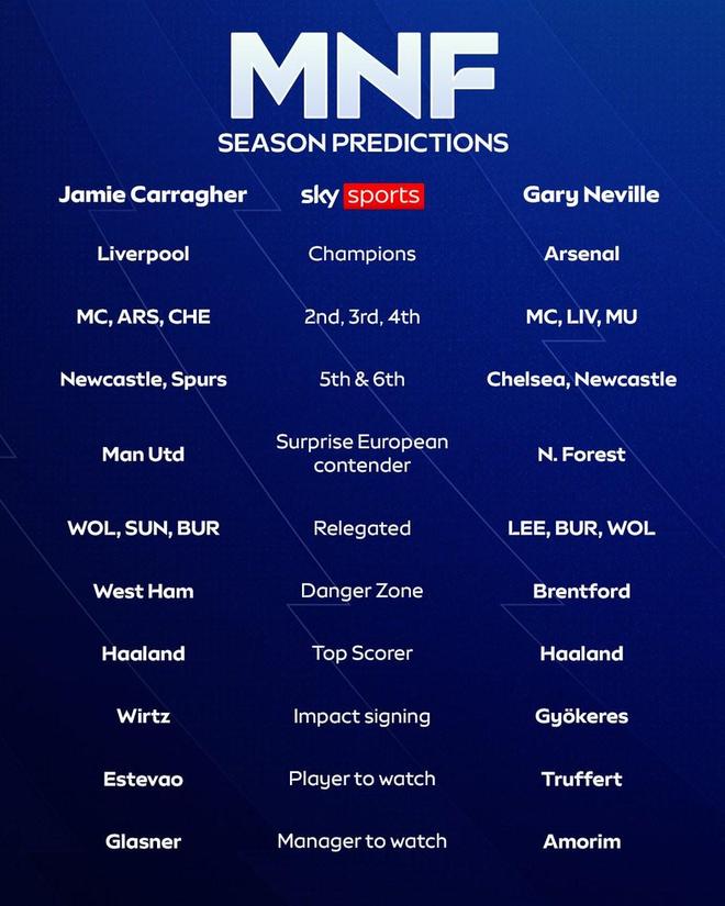 在天空体育新赛季英超首期“周一足球夜”节目中,卡拉格和加里-内维尔对本赛季英超冠军、欧战名额、降级、最佳射手等进行预测。卡拉格和内维尔预测本赛季英超(前为卡拉格,后为