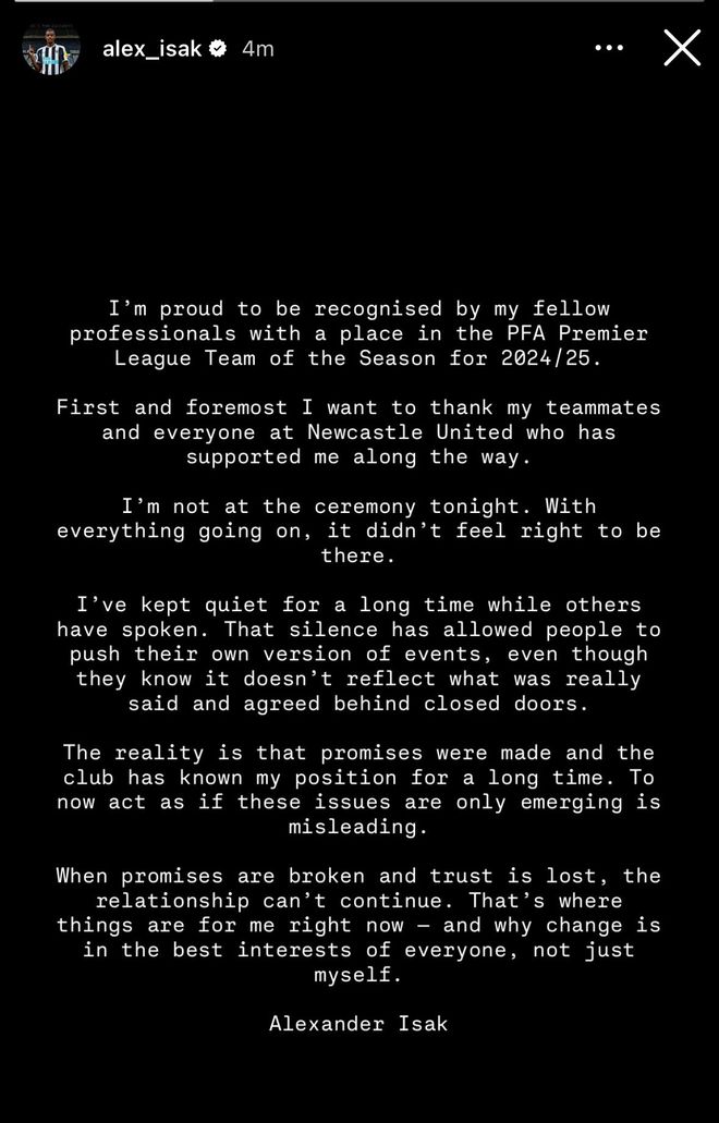 雷速体育8月20日讯 在入选PFA年度最佳阵容后,纽卡斯尔联前锋伊萨克在个人社交媒体发布长文,
