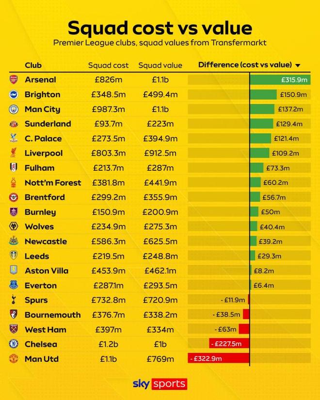 英超阵容性价比榜:枪手增值超3亿镑领跑曼联爆亏超3亿垫底