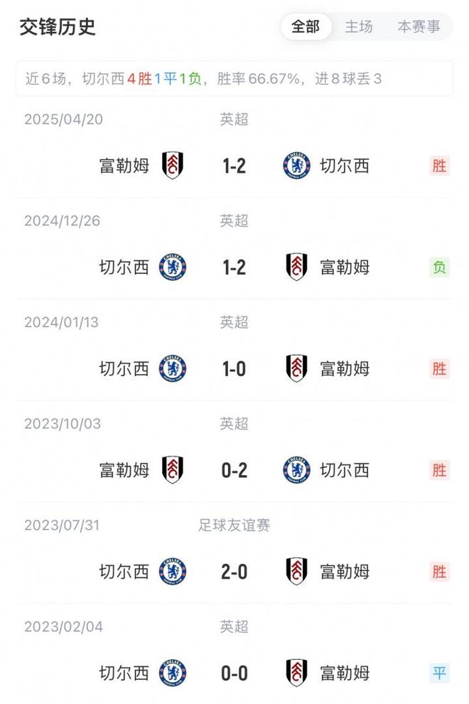 切尔西前两轮1胜1平暂列英超第4,;富勒姆前2轮分别逼平布莱顿和曼联,暂列英超第13。