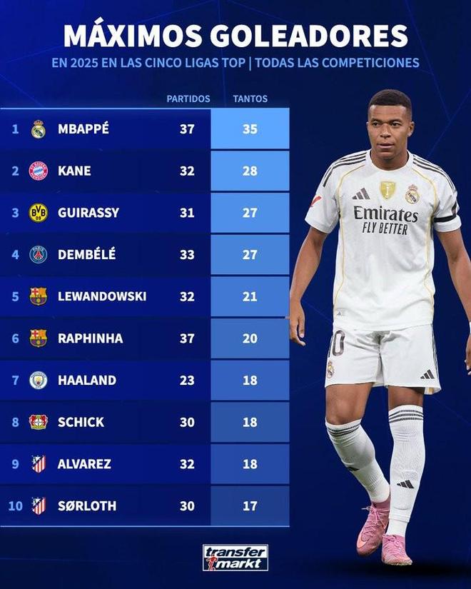 2025年至今五大联赛射手榜:姆巴佩35球居首,凯恩28球第二