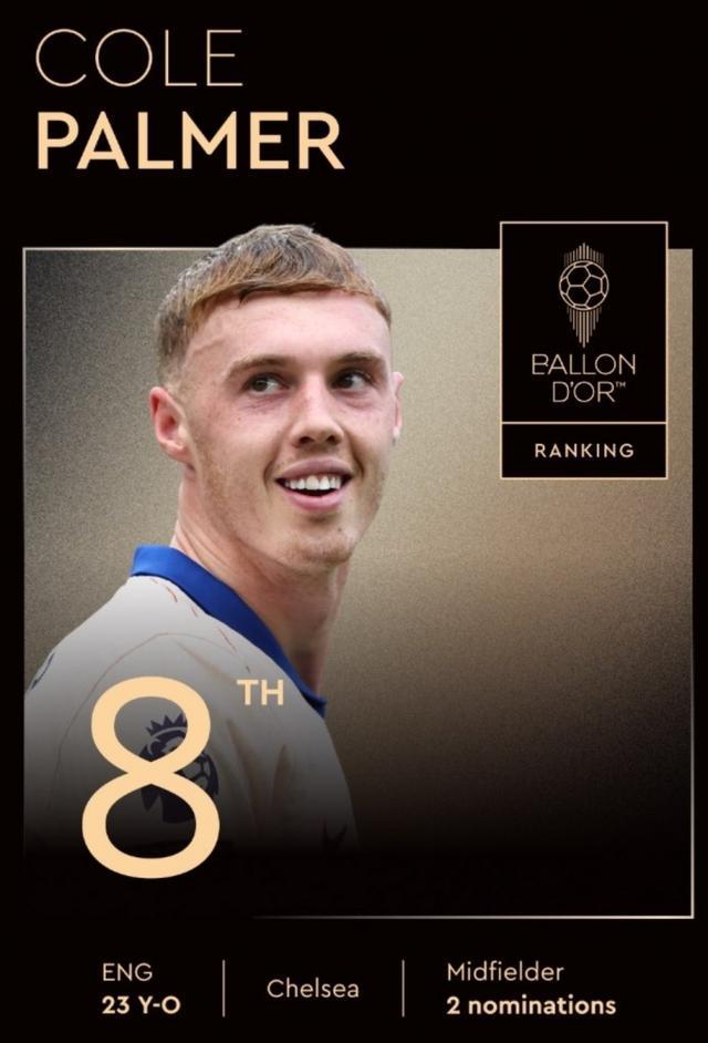 09月23日讯 金球奖排名昨晚出炉,切尔西球员帕尔默获得第8引发了争议。23岁的帕尔默是切尔西的核心球员,虽然上赛季下半段遭遇低谷,但是球员52场比赛也有18球14助的数据。他在欧