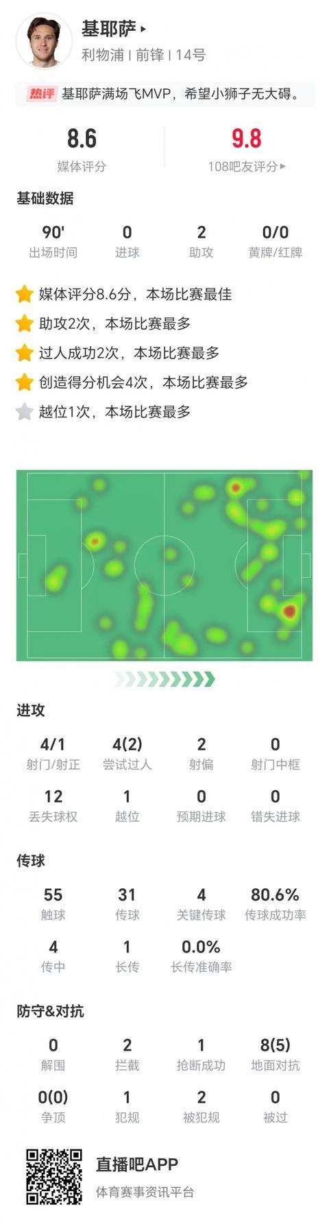此役基耶萨首发出战,送出2记助攻,帮助利物浦取胜,他当选本场比赛利物浦队内最佳球员。