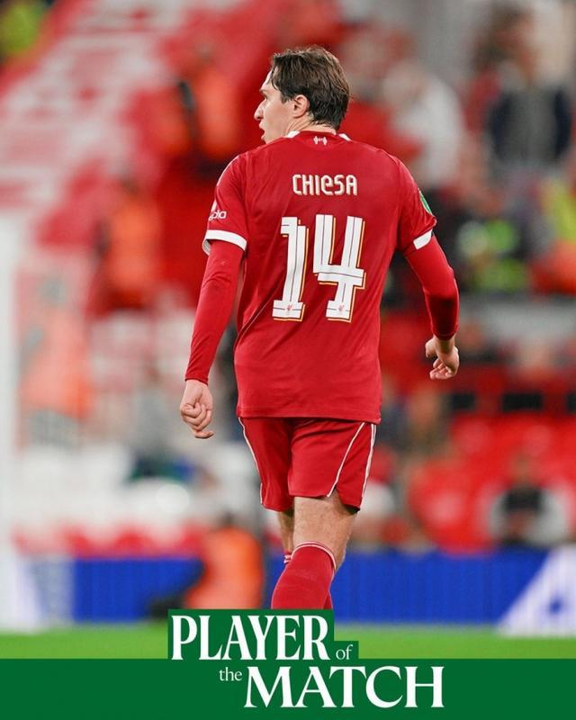 助攻双响!基耶萨当选联赛杯第三轮利物浦队内最佳球员