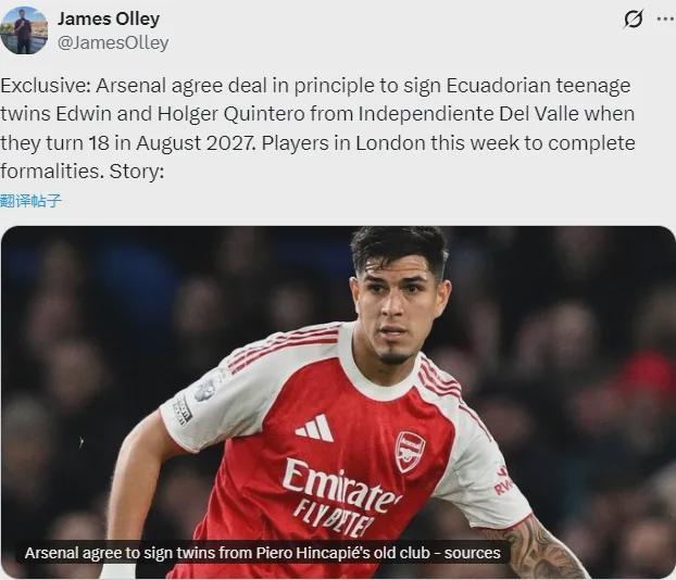 ESPN记者JO消息,阿森纳已经就2027年夏天(年满18周岁时)从山谷独立俱乐部收购双胞胎兄弟埃德温-金特罗和霍尔格-金特罗达成了原则性协议。