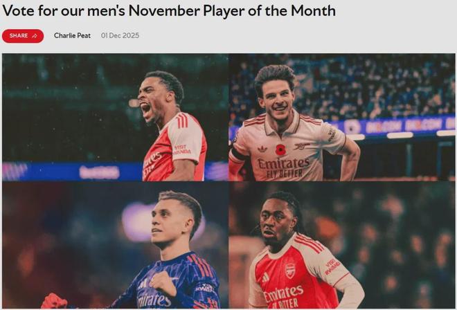 官方:阿森纳宣布廷贝尔、赖斯、特罗萨德和埃泽被提名为了11月队内最佳候选。