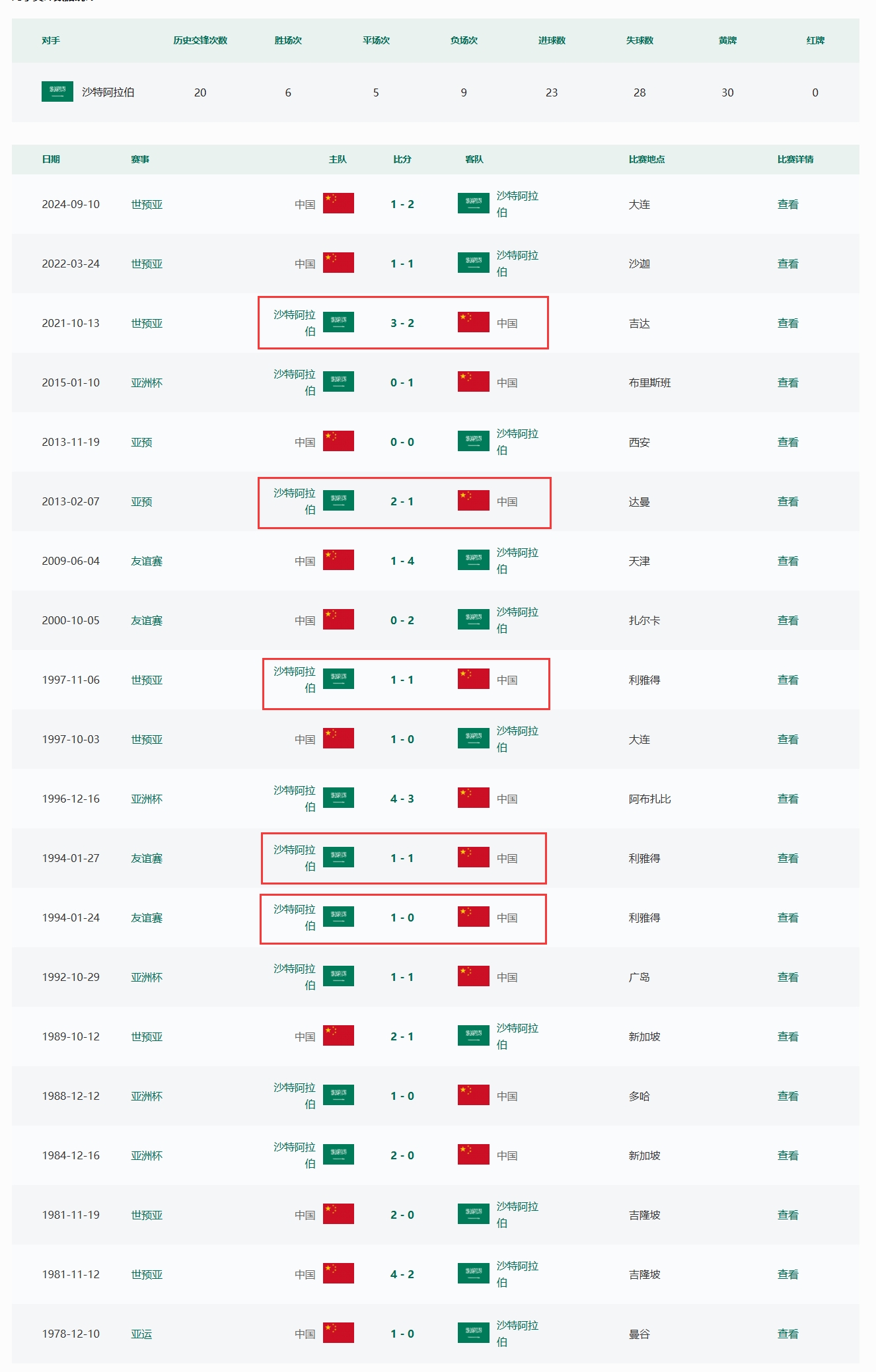 历史交手数据显示,国足共20次交手沙特,取得6胜5平9负的战绩。