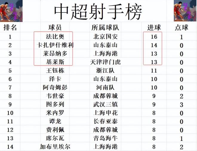 射手榜方面,法比奥梅开二度后,16球继续稳居第一。卡扎伊什维利打入一球,14球还是排在第2。基莱斯打入一球后,则是追上莱昂纳多,两人13球并列第3。王钰栋错失良机未能破门,还是11球位列第5,加布里埃尔,费利佩,谭龙等人则是8球刚好挤入前十。