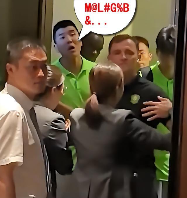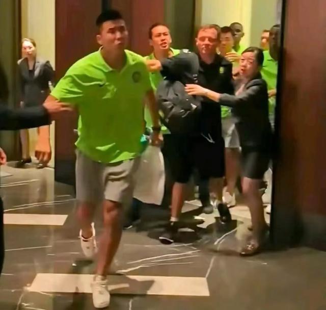 就在电梯即将关门时,队长王刚依然怒气未消,对着球迷口吐芬芳,并喊着“怎么啦,怎么啦?”。不知咋的,这位前国脚再次被刺激一般,再次怒气冲冲地要冲出电梯找谁算账,好在电梯门口两名服务员严防死守,这才把国安球员又一波进攻按在电梯里。
